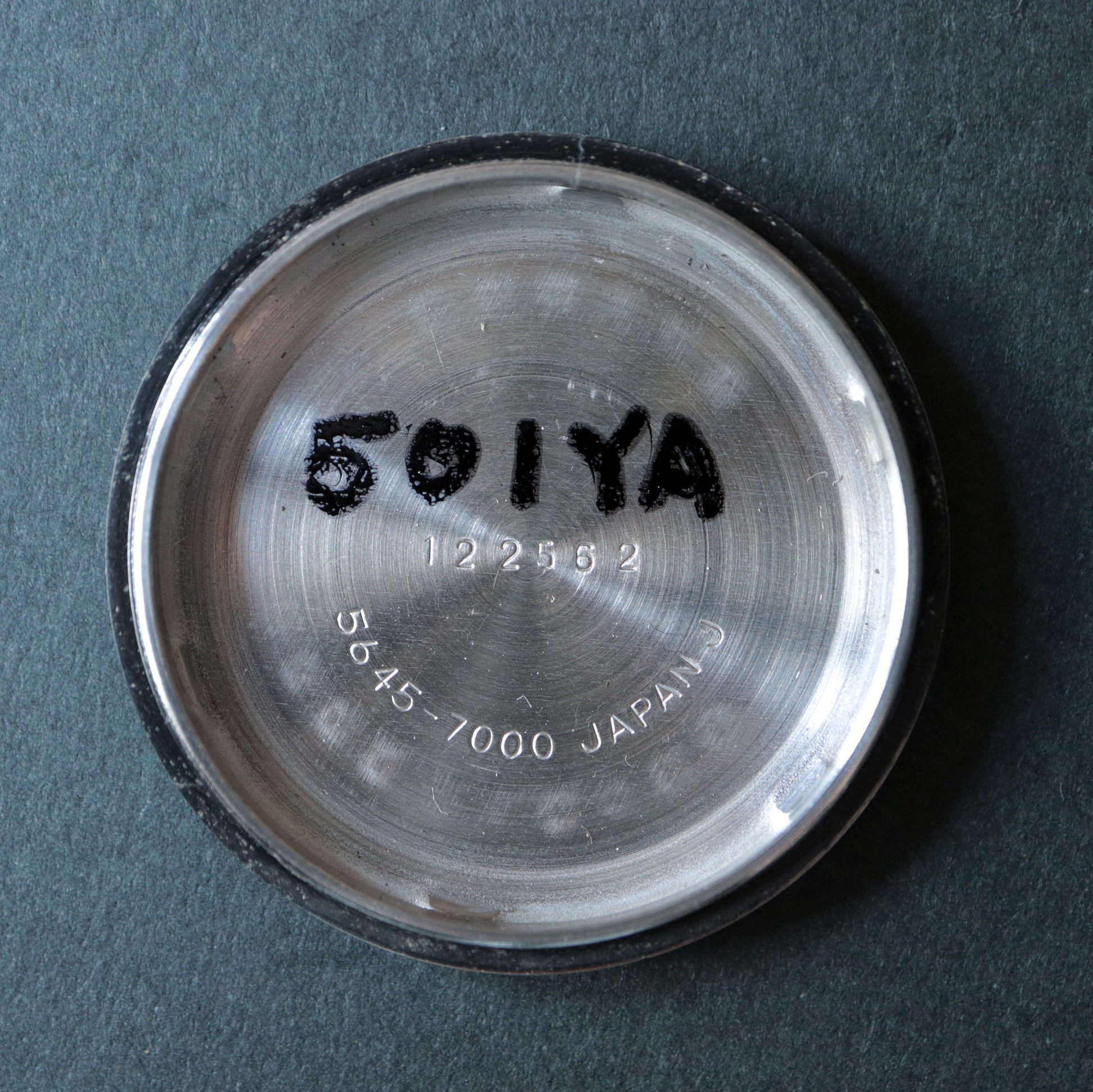 裏蓋中央にはGSメダリオンが配され、その外周に「出光創業六十周年記念」「昭和四十六年」の刻印が確認できます。
